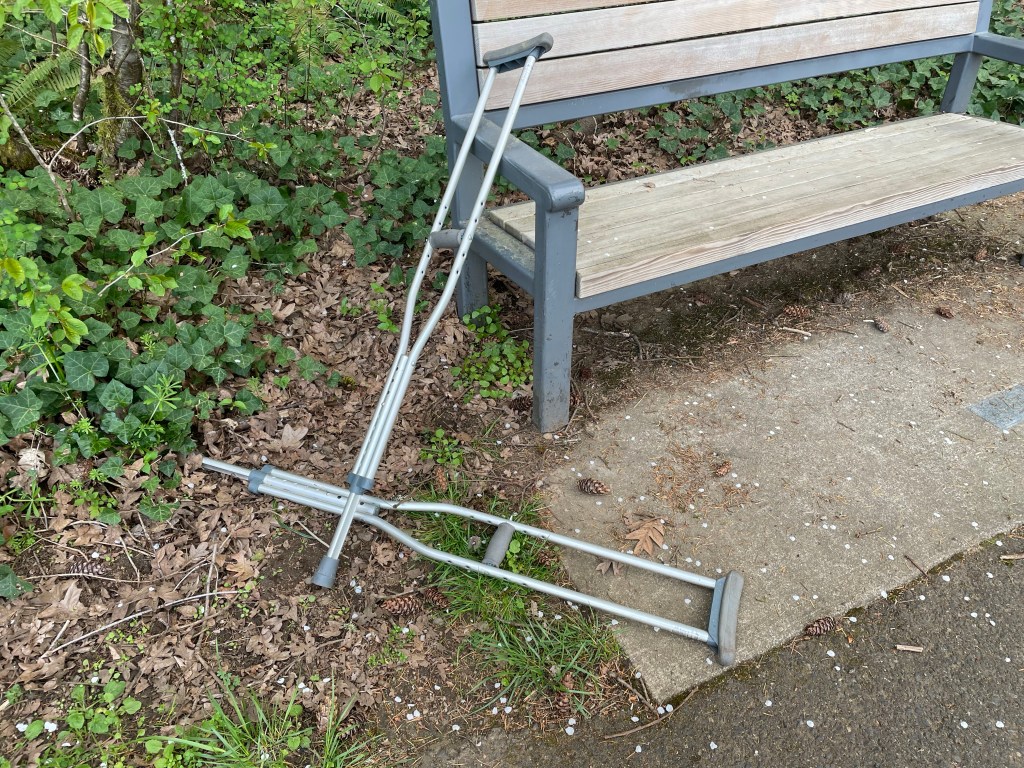 I walked along the trail today. It was a capricious Spring Day with occasional out-of-control showers and outbursts of magnificent sunlight. This was a rare day where the park was not crowded with people. Usually there is somebody walking their dog, an occasional jogger or people on bicycle. But not today there was absolutely nobody in the park. It was enjoyable watching the ever-changing sky and letting the dogs enjoy their walk. Trillium lined either side of the trail and as I walked around a bend I approached a familiar park bench. On this park bench sat a pair crutches with no person attached to them. I don’t think I’ve ever seen a pair of crutches unattached, other than those hanging in my garage. And the concept of crutches usually infers that one can not actually walk. So someone or somebody had to walk away from spurned crutches.