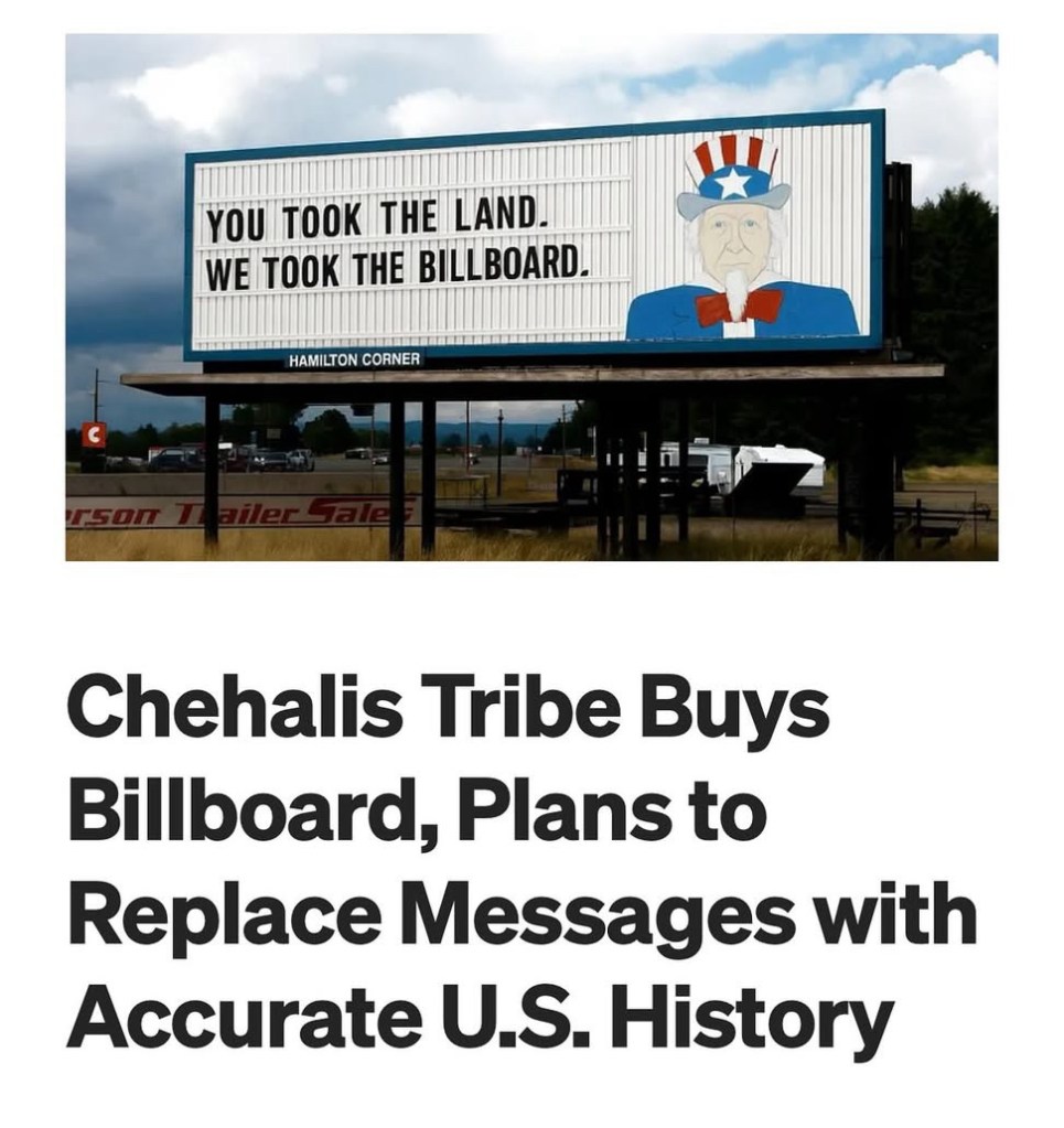 On I5, between Portland and Seattle, there has been a billboard spewing conservative propaganda for years. The native tribes have purchased the land and will be putting history lessons on the billboard.
