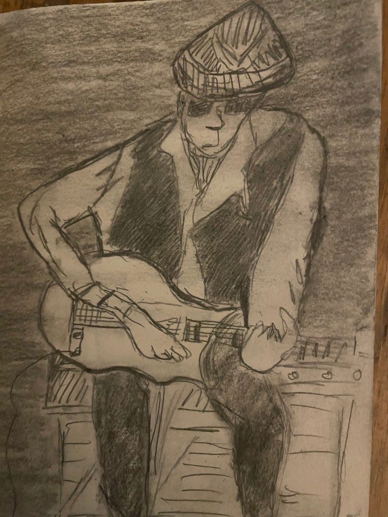 I was sketching and my mind went to a friend who recently lost his wife to cancer. I have not talked him much but I know he is losing him self in his band, they are called the Waxwings. I sent him this photo.