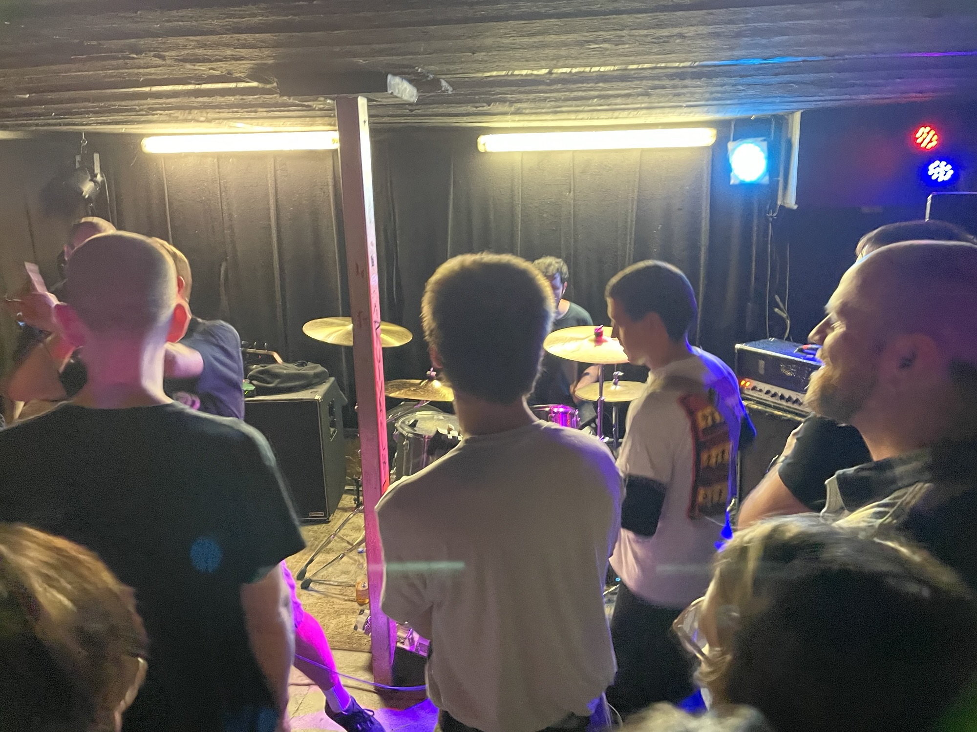 Nachdem wir unsere Tickets gekauft hatten, wurden wir die Treppe hinunter in einen Keller geführt, der voller Menschen war. Es war größtenteils ein männliches Publikum unterschiedlichen Alters. Es schien eine Skateboarder-Crowd zu sein. Ich persönlich mag laute Musik, und als man mir ein Set Ohrstöpsel anbot, lehnte ich zunächst ab. Die erste Band kam auf die Bühne, und sie waren kurz und auf den Punkt. Ihr Set dauerte nur 12 Minuten. Ich glaube nicht, dass an diesem Abend ein Song länger als drei Minuten war.